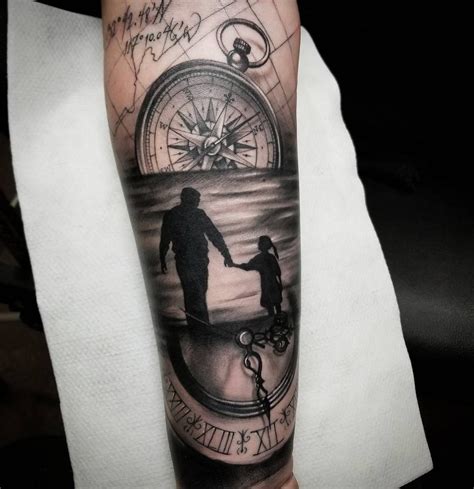 The best of these tattoos evoke memories of black and white film and old photographs resurrected from dusty boxes and forgotten drawers. This tattoo, placed over the heart, uses an ornate, cursive script along with fine line flourishes to commemorate the wearer’s daughter. Father and son tattoo design with clock ideas on arm for men. In the tattoo, the dad.