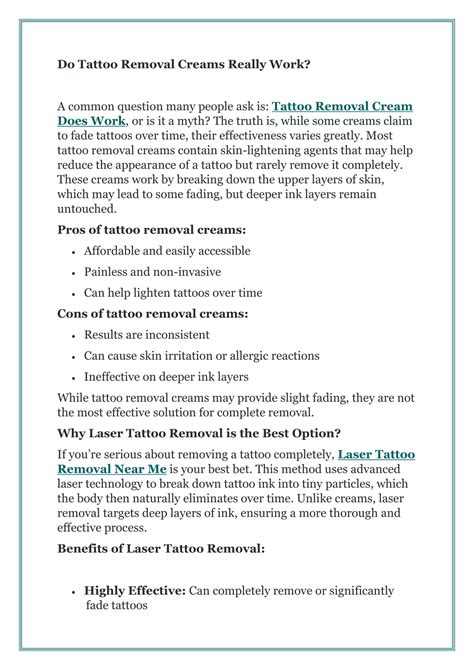 However, tattoo ink is inserted deeper than the epidermis, it lays deeper within the dermis. There's no evidence that tattoo removal creams work. Do tattoo removal creams work? Side effects of using tattoo removal creams: The short answer is “no.” a tattoo removal cream will not remove your tattoo.
