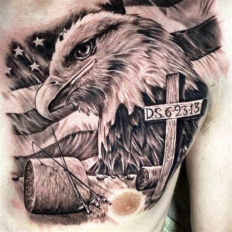 Eagle and scull tattoo on the chest and stomach. Further, the eagle’s wings are wide open to make the cross more radiant and brighter for the eyes. About the artist symbol of the evangelist john, the eagle is the icon for strength of faith.