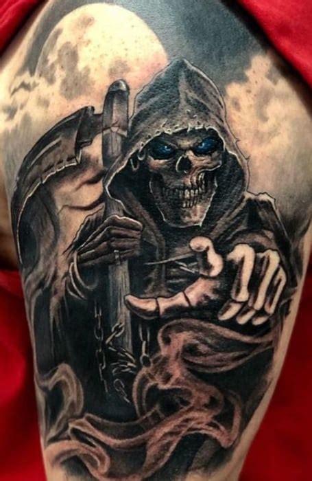 Often shown as a skeleton, the grim reaper appears to claim the souls of the dying and bring them into the afterlife. You can try a grim reaper tattoo in action where the reaper is. See more ideas about grim reaper tattoo, reaper tattoo, grim reaper. This is one of those grim reaper tattoo designs which can be tweaked in.