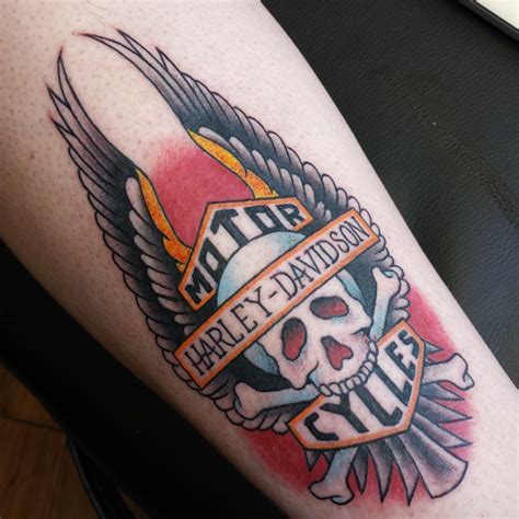 Harley tattoos are usually combined with: The wings and engine combo make a nice, crisply executed contrast of lines and styles to give the overall tattoo a new school vibe. Ever since william s harley and brothers arthur and walter davidson opened the doors to their small shed and rolled out their first motorcycle, harley davidson has been a name.