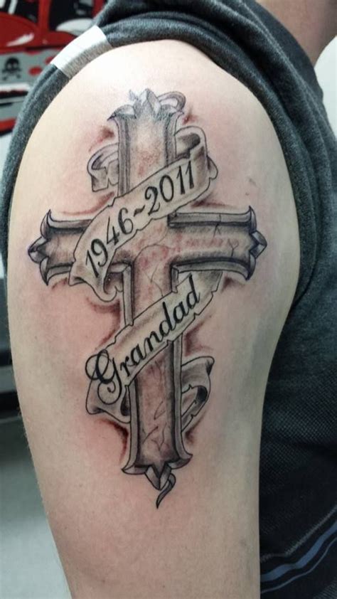 A cool rip tattoos for men creation, it appears as a very heavy stone or metal cross. See more ideas about memorial tattoos, cross tattoo, cross tattoo designs. 3.2 dog memorial tattoos quote. Rest in peace cross with mother banner memorial tattoo right shoulder angel wings cross tattoo for men rip dad memorial banner with cross tattoo on right back.