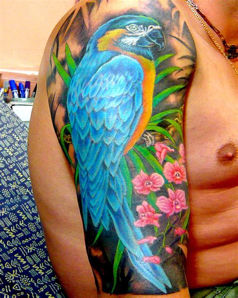 Parrot Tattoos, Our commitment does not stop there we are going to be there to answer your questions and help you to care for your new tattoo with our h2ocean aftercare products to help speed the healing process. The parrot tattoos give the wearer the chance to show off their own uniqueness and secretive side in a colorful manner.