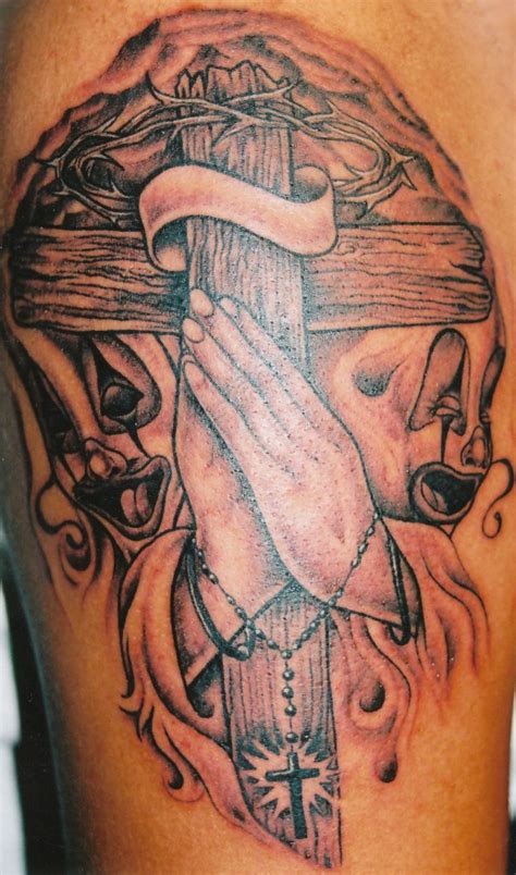 The most popular areas to etch small cross tattoos include: Praying hands tattoos will look great once paired along with either a cross or a rosary. It’s very moving and uplifting seeing someone praying devoutly to god, either for help or blessing. The tattoo is an obvious sign of strong devotion.