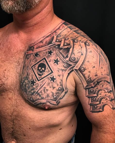 Looks like valentin hirsh enjoys knight tattoos. After all, a warrior, unlike a soldier, is not a title, it is a state of mind. Cool shoulder armor with a red insignia and some quotes tattoo. You can always extend your shoulder armor tattoo into a sleeve or chest tattoo.