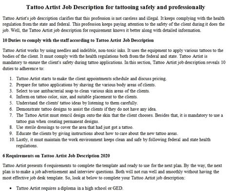 What are the job description for a tattoo artist? [ job description ] 10. Build a tattoo apprenticeship portfolio of yourself. Here's how sterilize equipment is used on tattoo artist resumes: Some tattoo artists might also perform other forms of body modification, such as piercings or brandings.